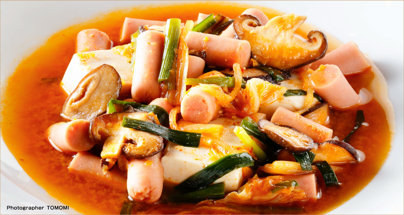 ④に6等分した豆腐と①のポールウインナーを入れて強火にし、沸騰後弱火にして5〜6分煮る(味を見て、塩や醤油などで調整する)