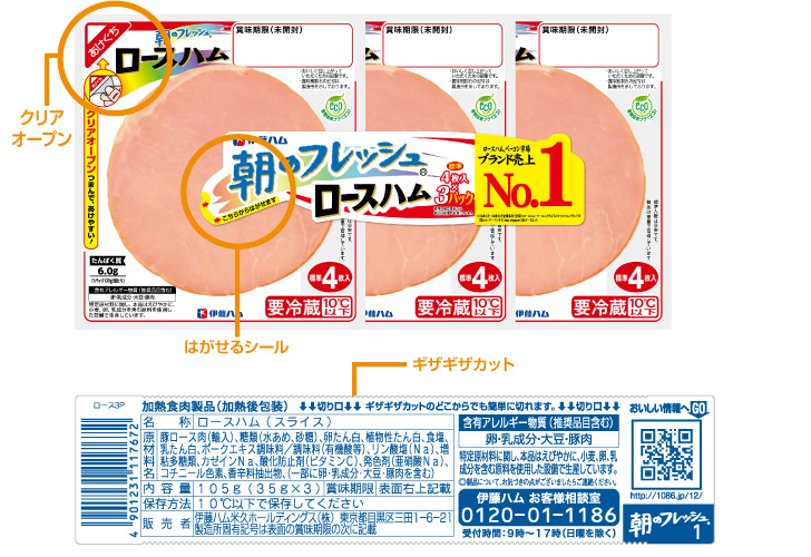 裏のシールには「ギザギザカット」があるので、使うときに1パックずつ簡単に切ることができます。パッケージをあけるときは、「クリアオープン」でつまんであけやすくなっています。