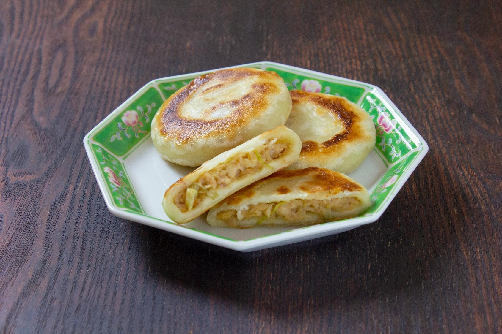 焼餅(シャーピン)とは、肉や野菜などの餡を生地で包んで焼いた、屋台で親しみのあるおやき風料理です。もち米粉を使ったもっちり食感の皮に、豚肉・ザーサイ・たけのこ水煮を合わせた、こだわりの餡が特長です。フライパンで蒸し焼きにすると、カリもちっとした皮の食感が楽しめます。