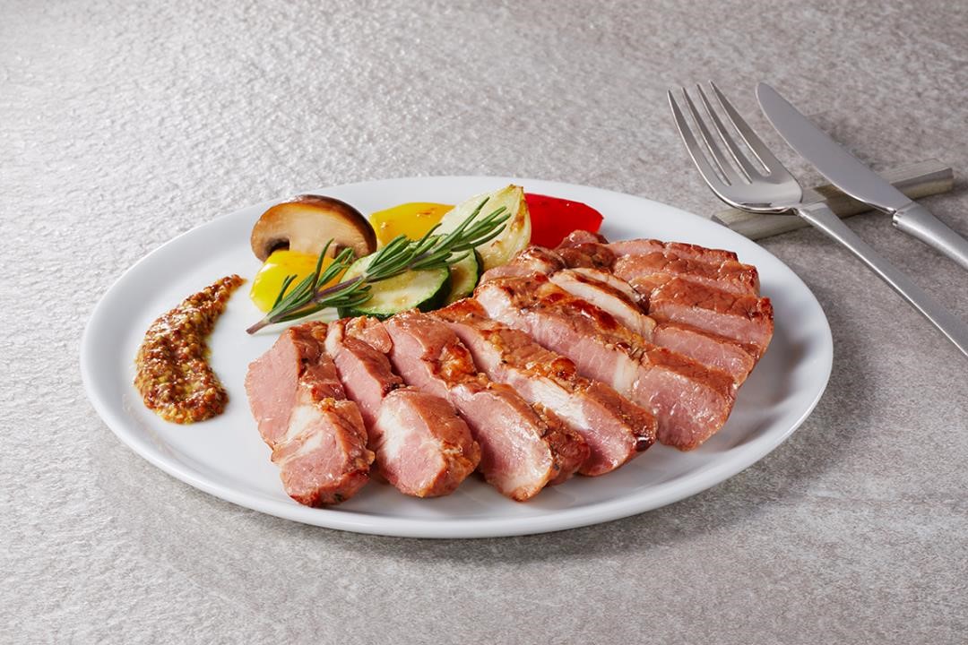 ポイント2 低温真空調理で、しっとり仕上げたポークステーキ