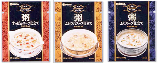 「粥 すっぽんスープ仕立て」「粥 ふかひれスープ仕立て」「粥 ふぐスープ仕立て」の3種。「粥 すっぽんスープ仕立て」は滋養強壮食品のすっぽん、「粥 ふかひれスープ仕立て」はコラーゲンたっぷりのふかひれ、「ふぐスープ仕立て」には健康食品の定番素材「アガリクス茸」といった、栄養豊かな高級食材をたっぷり使った健康とおいしさへのこだわりが凝縮されたお粥です。