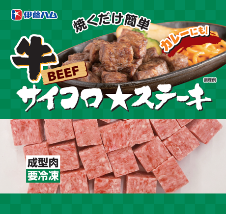 歯切れが良くやわらかい牛サイコロステーキ(成型肉)です。崩れにくいので、焼くだけでなくカレーやビーフシチューなど煮込み料理にもお使いいただけます。
