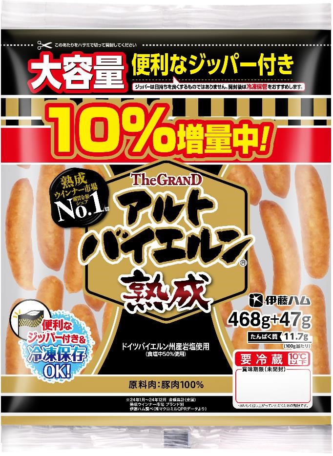 確かな肉粒感を感じつつも、熟成ならではのここち良い口あたりが特長です。「伝承熟成」製法による「エイジング」から生まれるコクをさらに深くする為に、香辛料等の種類や配合を考えていますので、コク・余韻をお楽しみいただけます。