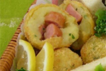 (4) (2)を4等分に分けてラップに広げ、(3)を中心において丸く包み、小麦粉、溶き卵、パン粉をつけて180℃の油で揚げる。