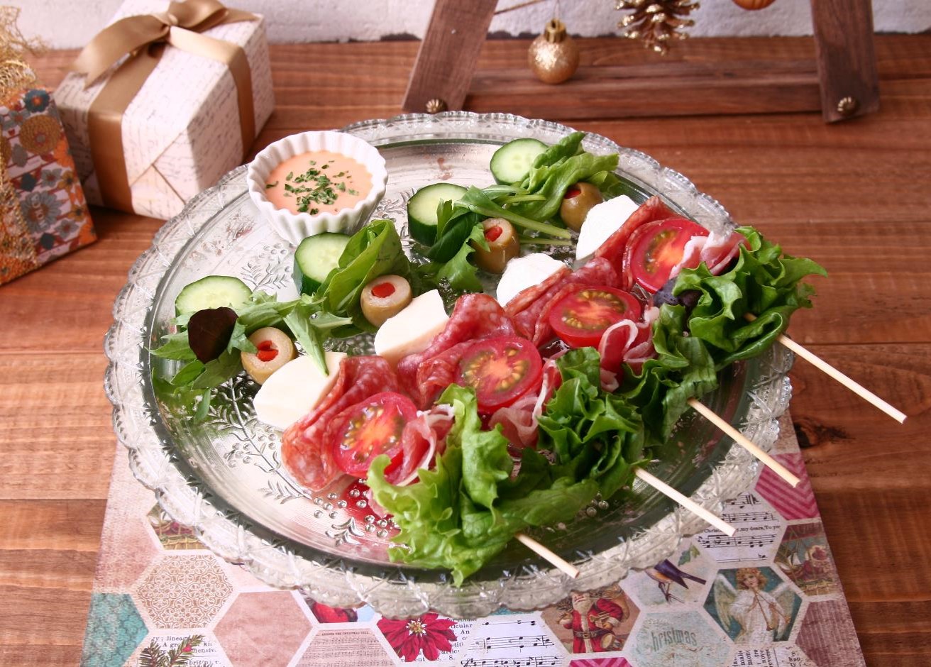 (2) 串にグリーンリーフ、生ハムロース、ミニトマト、生サラミスライス、モッツァレラチーズ、オリーブ、ベビーリーフ、きゅうりの順に串に刺し、お好みのドレッシングを小鉢に入れて添える。