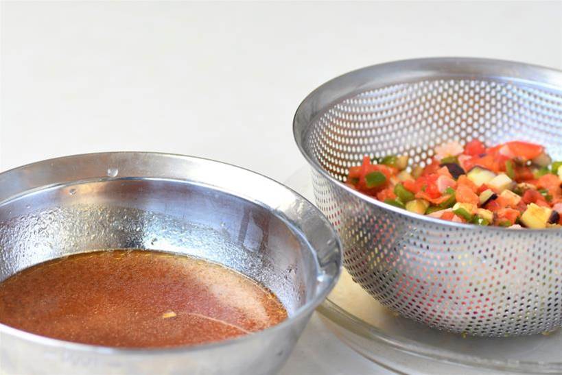 耐熱容器に①の野菜を入れ、オリーブオイルをかけて混ぜる。ラップをして、600Wの電子レンジに5分かけ、下から混ぜ、再びラップをし、さらに電子レンジに5分かける。ざるでこし、スープと具を分ける。出てきたスープと市販の麺つゆを混ぜる。